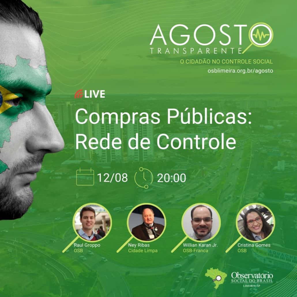 O segundo painel do Agosto Transparente do Observatório Social do Brasil – Limeira acontece nesta quarta (12), tendo como tema “Compras Públicas – Redes de Controle”. Raul Groppo, presidente do Conselho de Administração do OSB-Limeira, conversará com Ney da Nobrega Ribas, um dos fundadores da metodologia do Sistema OSB; Cristina Gomes, membro do Comitê de Compliance do Sistema OSB; e Willian Karan Junior, pós-graduado em Licitações e Contratos Administrativos e em Direito Público com ênfase em Gestão Pública e coordenador executivo do OSB-Franca.