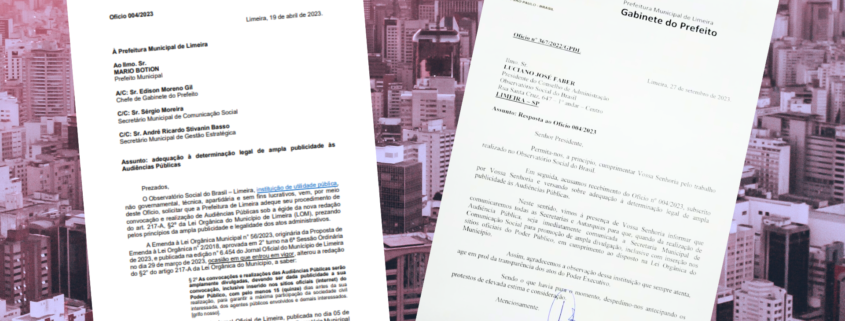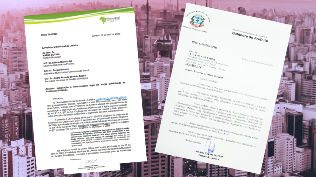 A Prefeitura acatou uma solicitação do Observatório Social do Brasil – Limeira para que dê ampla divulgação, nos canais oficiais do município, quando forem realizadas audiências públicas. Em ofício enviado ao prefeito Mario Botion, em abril, o presidente do Conselho de Administração do OSB-Limeira, Luciano Faber, requereu a adequação do procedimento de convocação e realização de audiências públicas à nova redação da Lei Orgânica do Município.