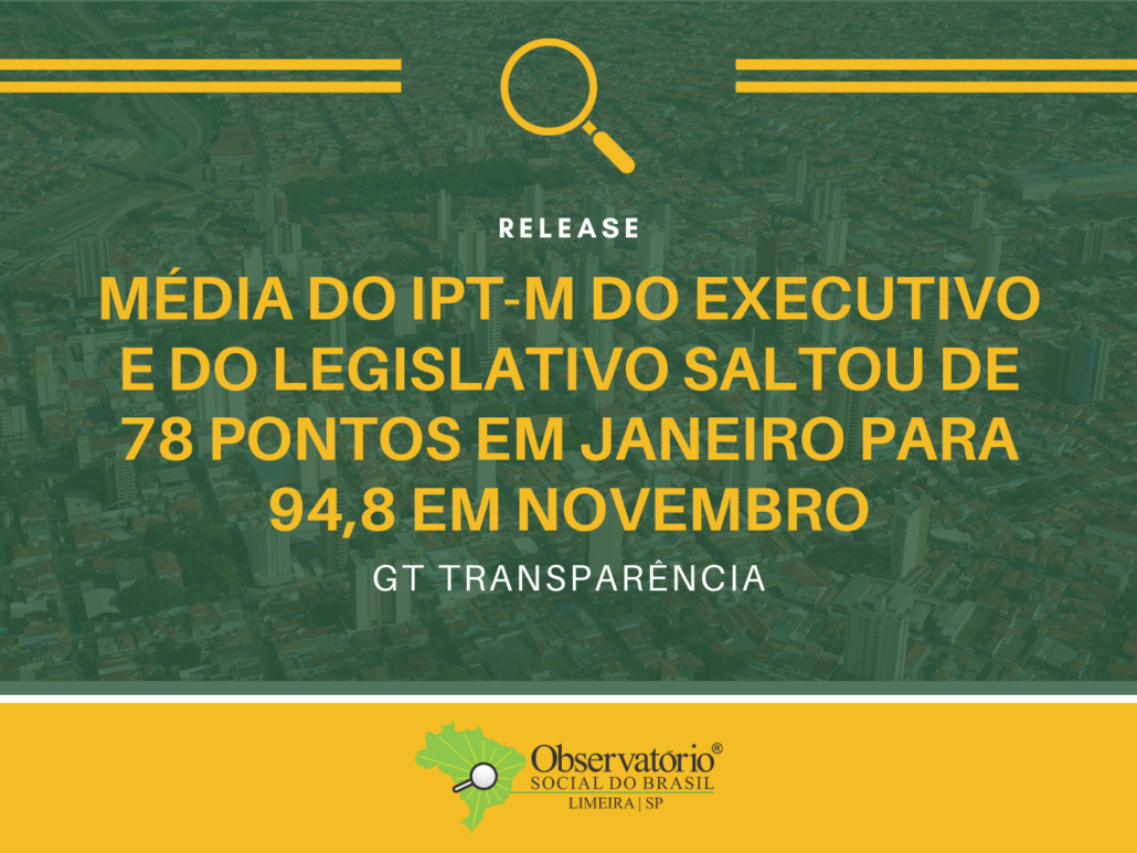 A evolução do Índice de Percepção da Transparência Municipal (IPT-M) neste ano foi motivo de comemoração para os voluntários do Grupo de Trabalho Transparência do Observatório Social do Brasil – Limeira. O índice geral, que reflete a média simples entre o IPT-M da Prefeitura e o da Câmara Municipal, saltou de 78 pontos, patamar considerado “bom”, em janeiro, para 94,8 em novembro, entrando no nível “ótimo”.