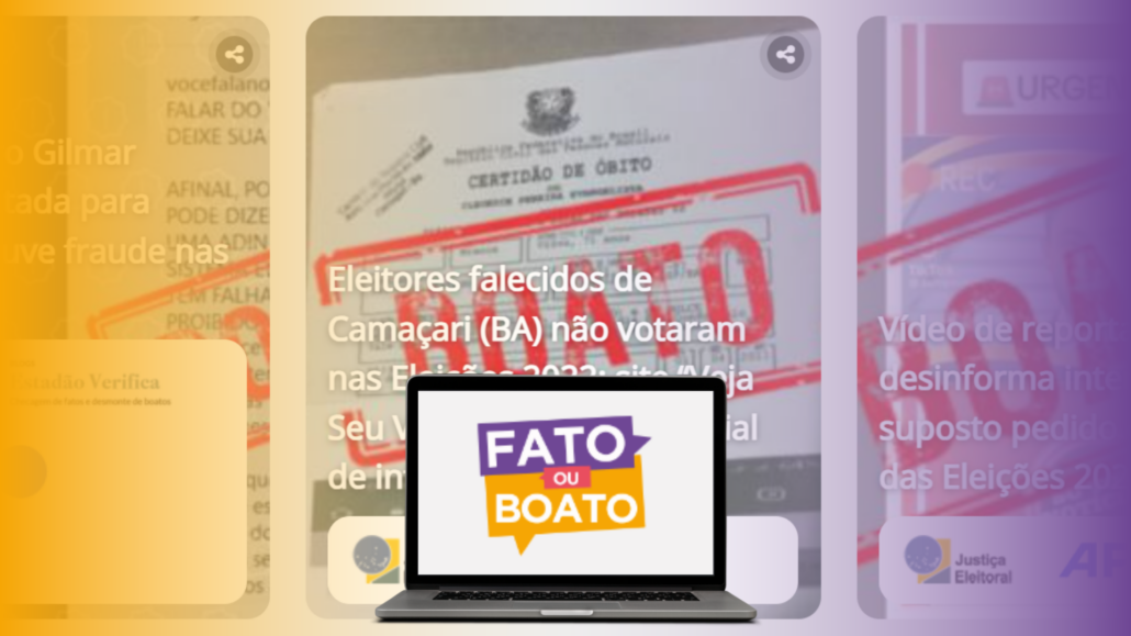 Trata-se de um site que a Justiça Eleitoral mantém exclusivamente para desmentir as principais fake news relacionadas às eleições, que circulam em especial nas redes sociais. Nele, encontram-se conteúdos sobre o sistema eleitoral, que podem ser compartilhados com amigos e familiares pelo WhatsApp, X, Facebook, Instagram e também por e-mail.