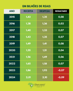 Nos dois últimos anos, no entanto, o cenário muda. Em 2023, as despesas passam a superar as receitas, e em 2024 o déficit chega ao maior valor da série: quase 90 milhões de reais.