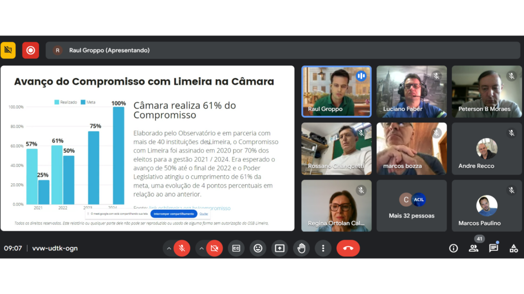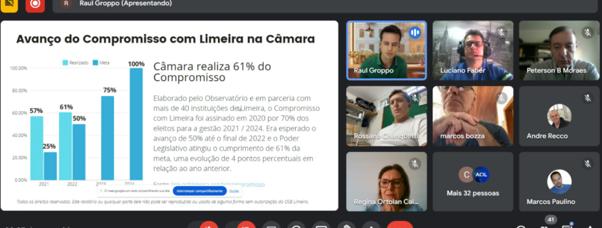 Representantes de mais de 40 instituições da sociedade civil participaram no dia 30 de abril de encontro virtual promovido pelo Observatório Social do Brasil – Limeira para apresentação do Termo de Compromisso com Limeira 2025-2028. Foram convidados para a reunião entidades sem vínculos partidários e investidores do OSB-Limeira, além dos voluntários e parceiros. No dia 23 de abril, evento semelhante foi voltado a partidos políticos e entidades com vínculos partidários.